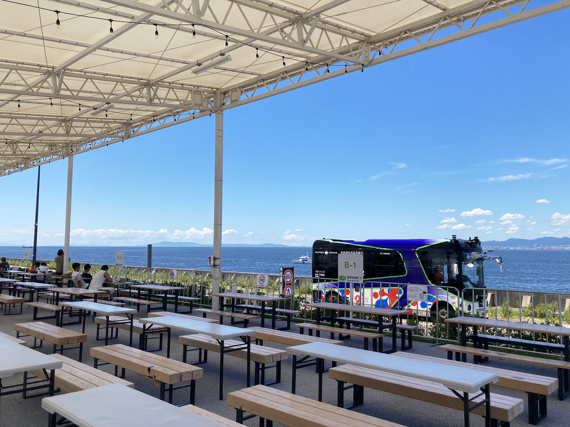 ただ問題なのは、このEXPOアリーナ『Matsuri』は野外なので、見ての通り屋根がありません。私が訪れた13日は曇りで日差しが弱かったので、とても快適だったのですが、まだまだ気温が30度を超えて熱中症等に注意が必要な気候なので、日差しが強い場合はEXPOアリーナ『Matsuri』の直ぐ隣、海側に面して広がっている団体休憩所がお薦めです。ここは屋根もあって目の前が大阪湾の海で、椅子もテーブルもあるので快適です。