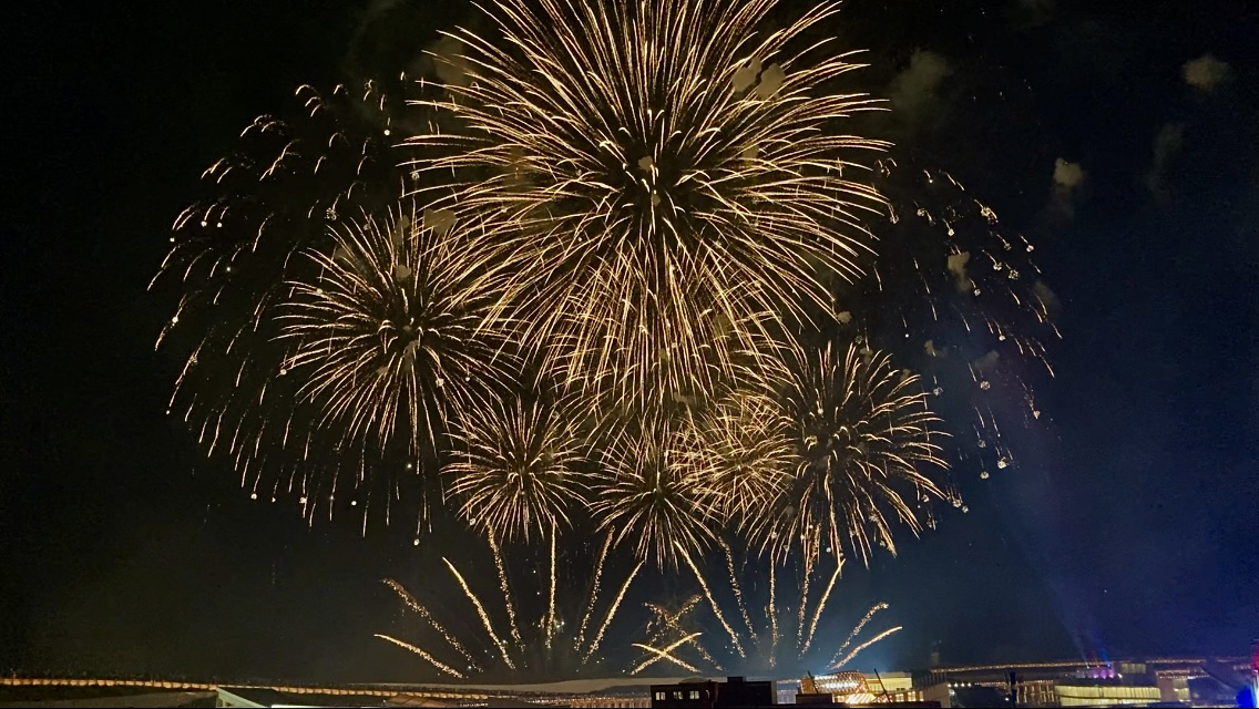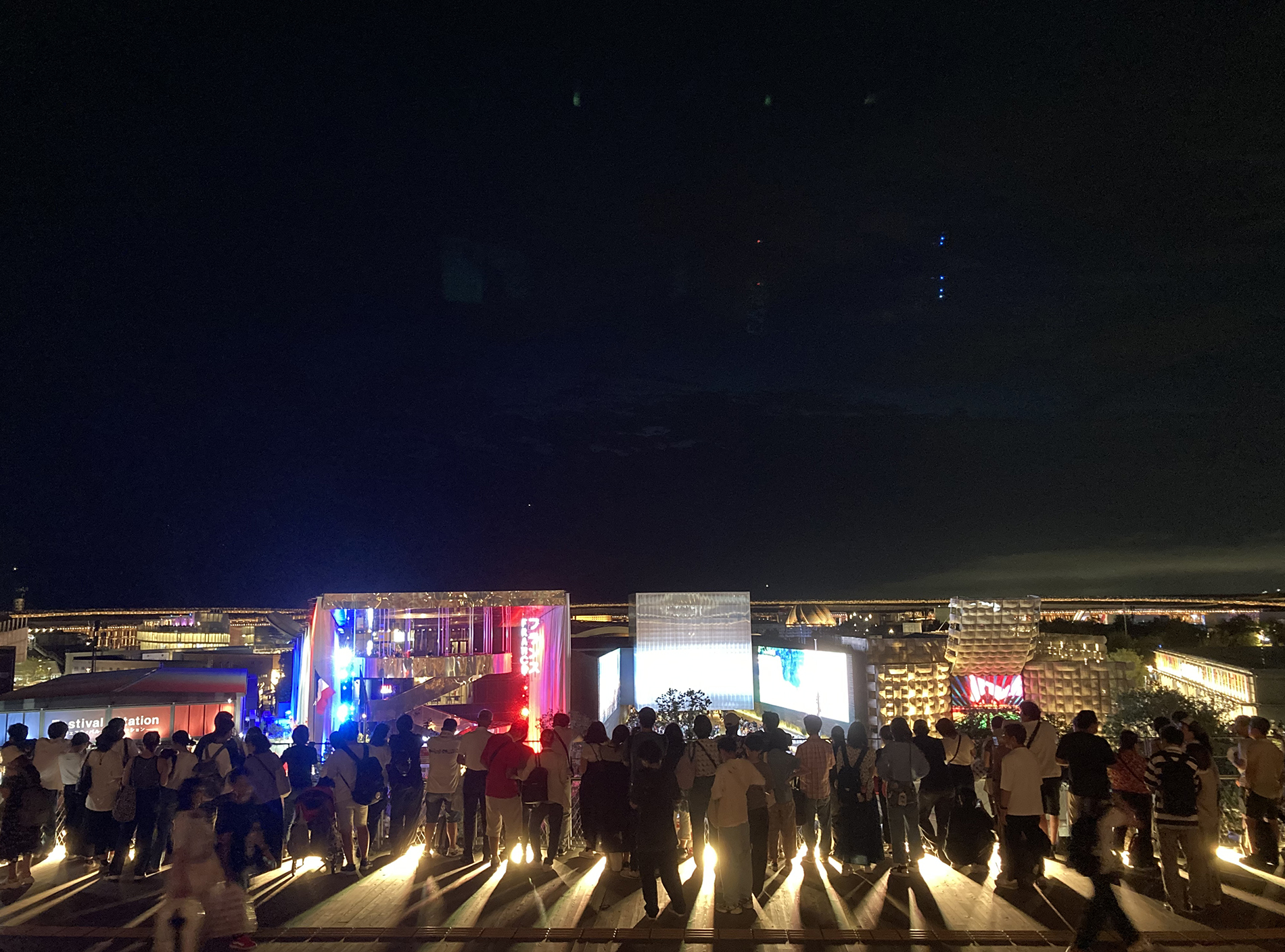 花火だと、中央部海側に人が集まりますが、このフランス館前の大屋根リング上だと、それほど混雑もせず視界も開けてバビリオン後しに見る花火も、なかなか素晴らしいです。