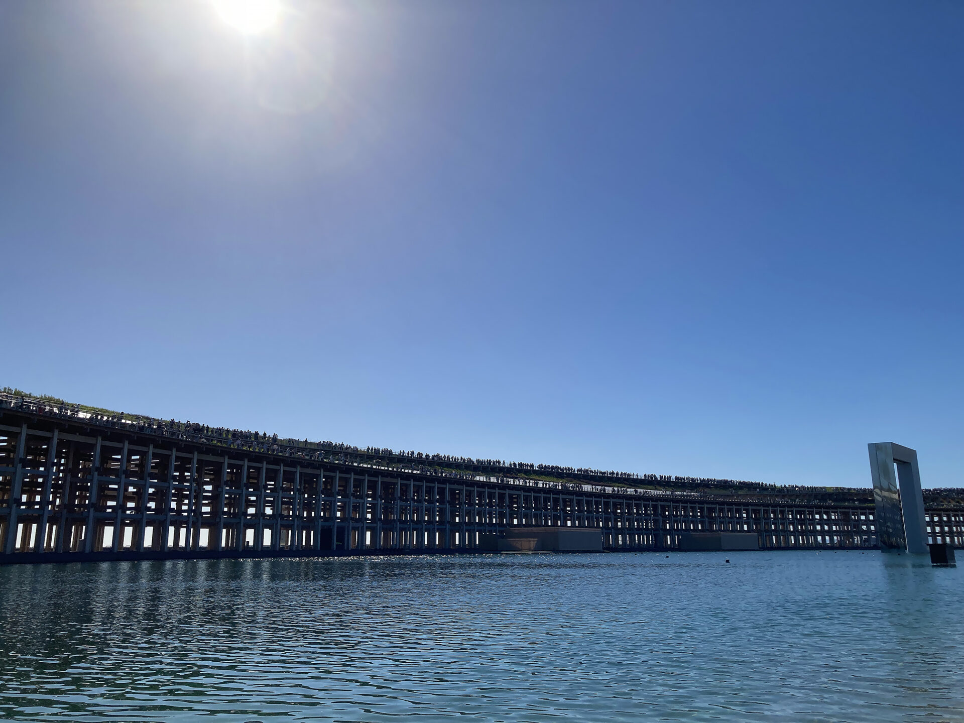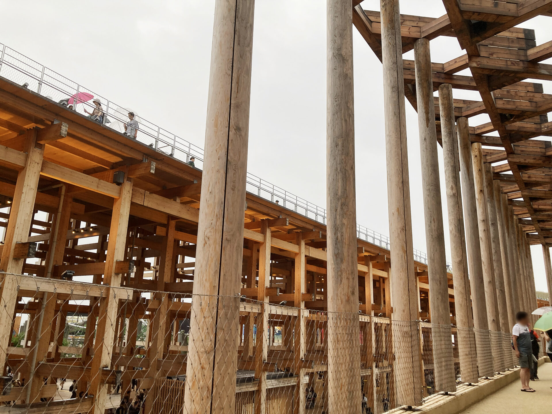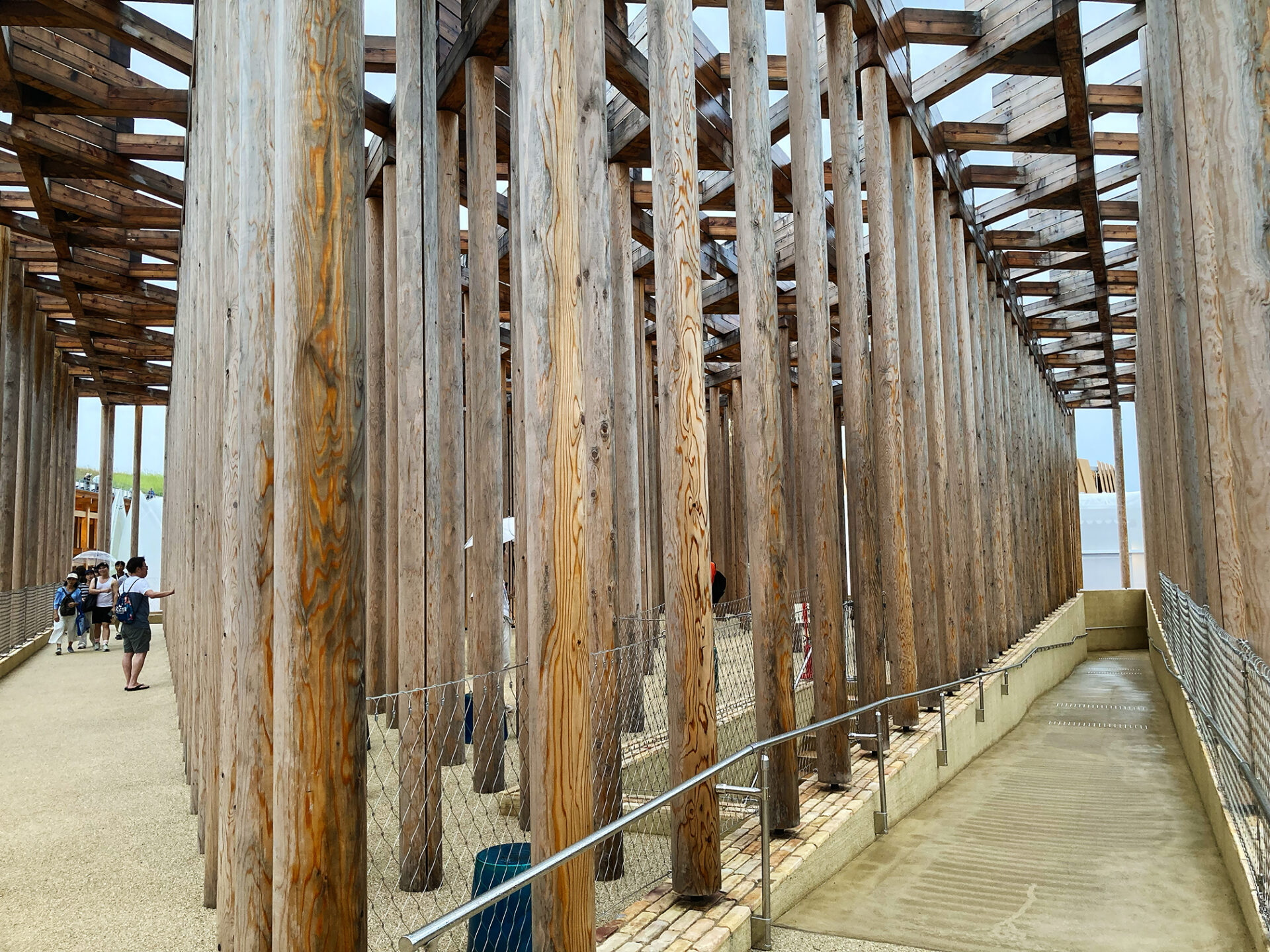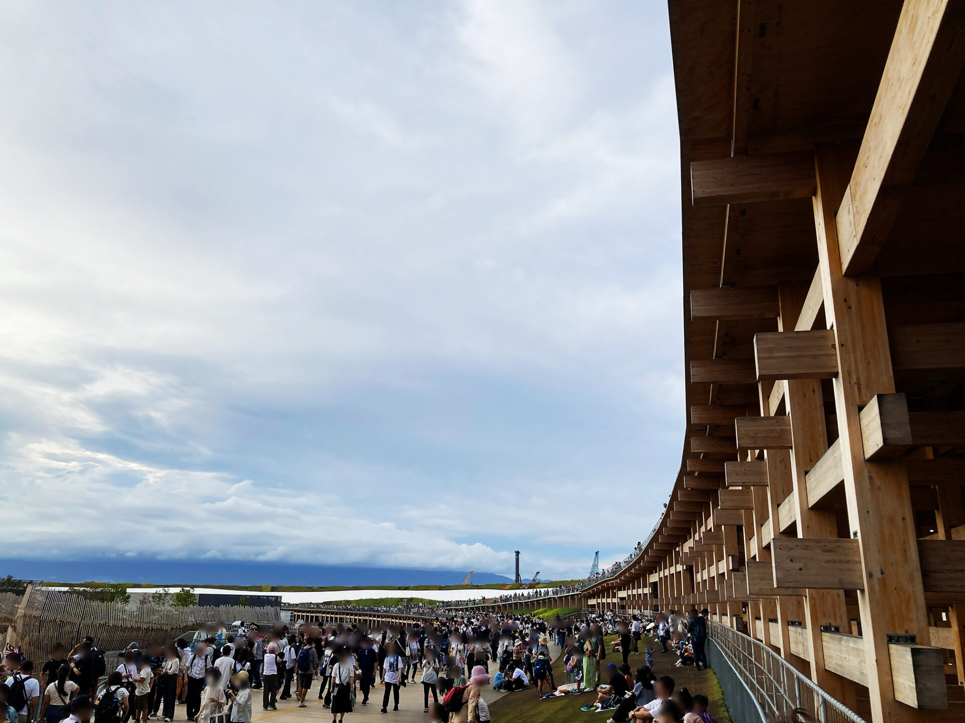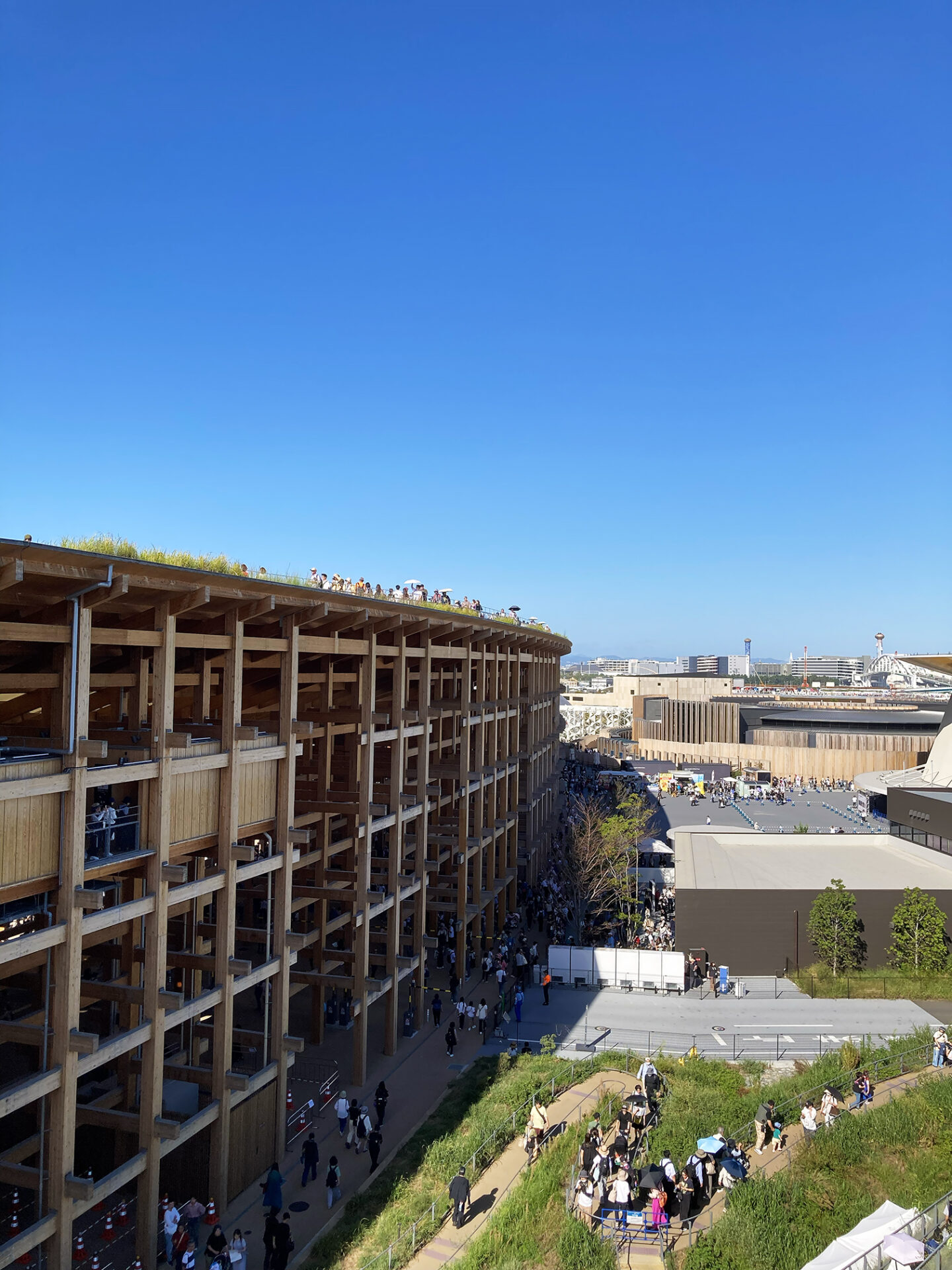 ゲートを潜って万博会場に入ると、遠くに大屋根リングが見えて「大きいねー」ってなるんですが、歩いて近付いていくと「まてまて、なんやコレ」って(笑)