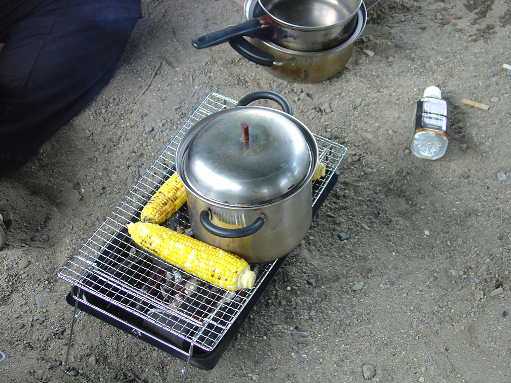 とりあえず、水が沸騰するまで時間が掛かりそうなので、その横でトウモロコシやサザエなんかを焼く。