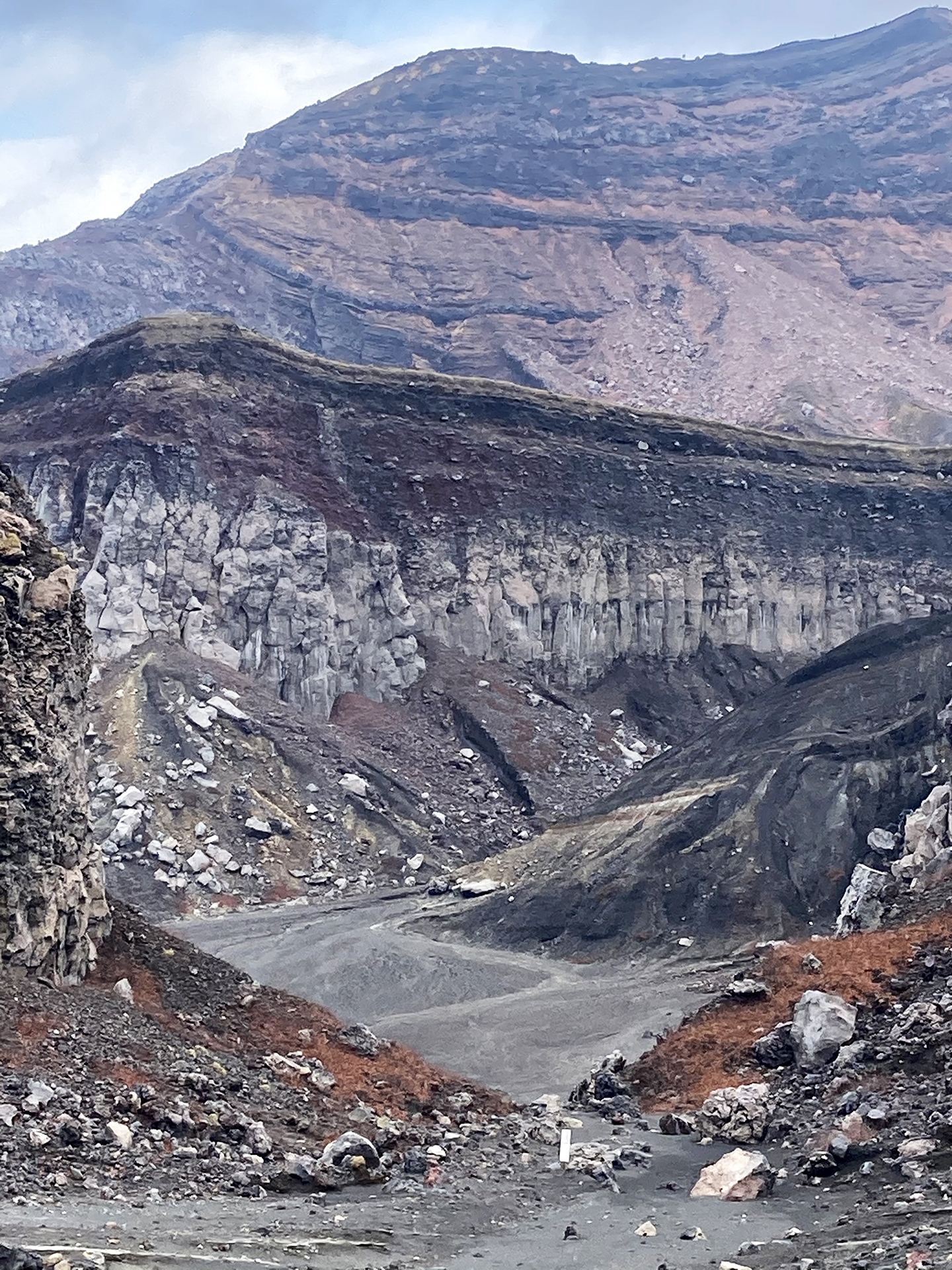 後ろを振り向くと、今も活動する火口からの煙が見えて、改めてその異様さと迫力を感じながら降って行きました。