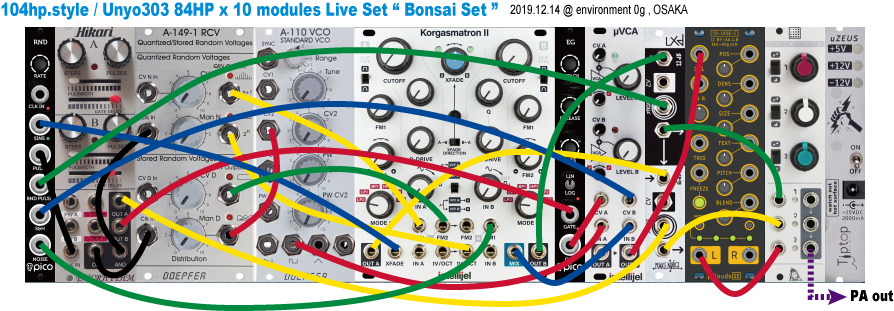 あくまでも、自分がやっていて、やりたい事が出来て、楽しめる、というのが絶対条件で、その中で色々な〝縛り〟を考えて、どうやってモジュールの選択やら、選んだモジュール同士、どのようなパッチングしたら予想外な事やら、縛りとは思えないぐらいの広がりが生まれるだろうか、みたいな事も楽しんでいます。
